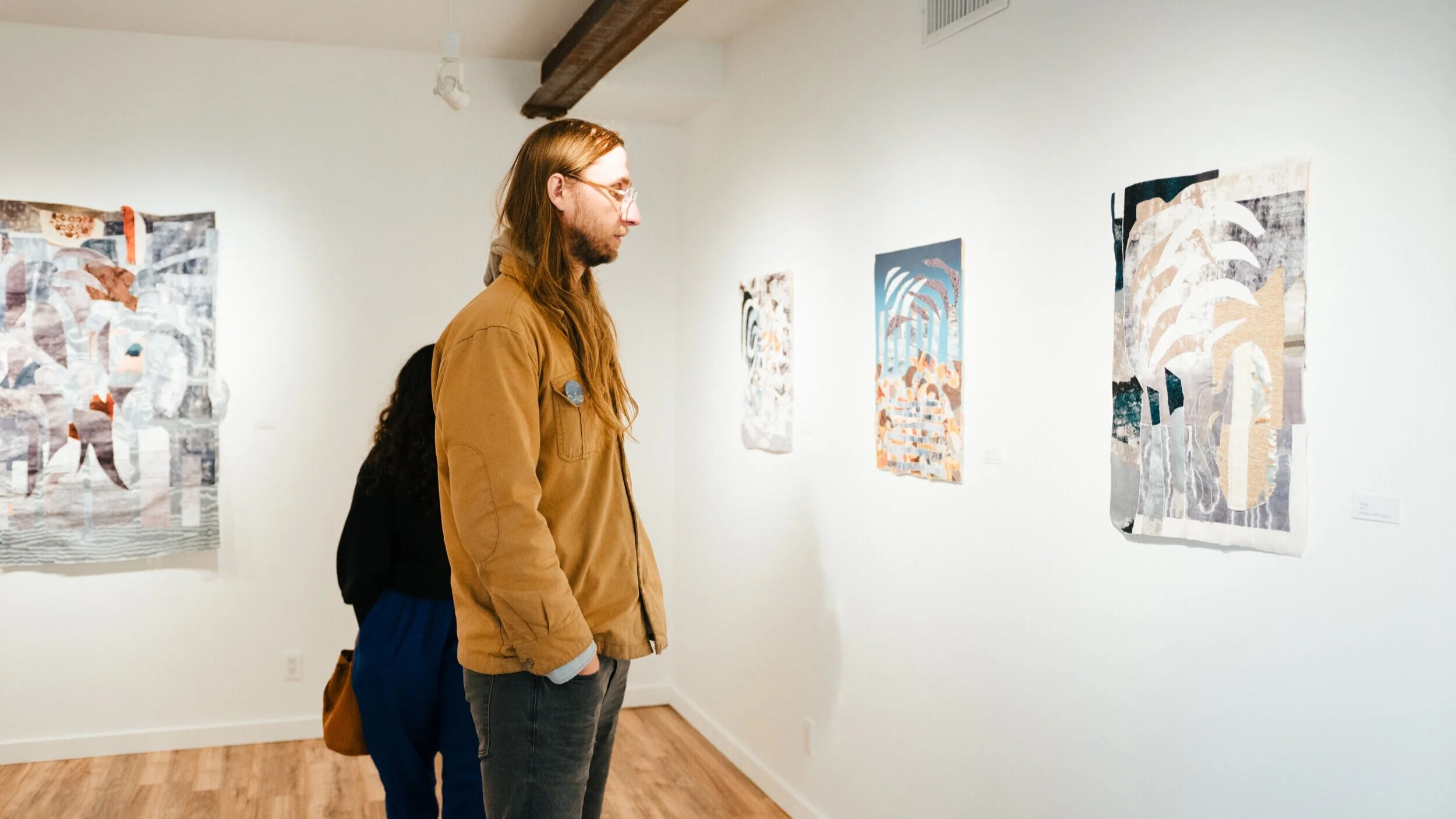 Toward a new mythos portrays my journey of creating a personal mythology through reclaimed fabric appliqué tapestries. This exhibition includes my "Something Sacred" series, in which I combine my memories of visiting Lebanon with Islamic folklore to create abstract landscapes. Three larger tapestries in the exhibition expand on this idea, portraying the life cycles of angels and jinn when they inhabited the Earth.
